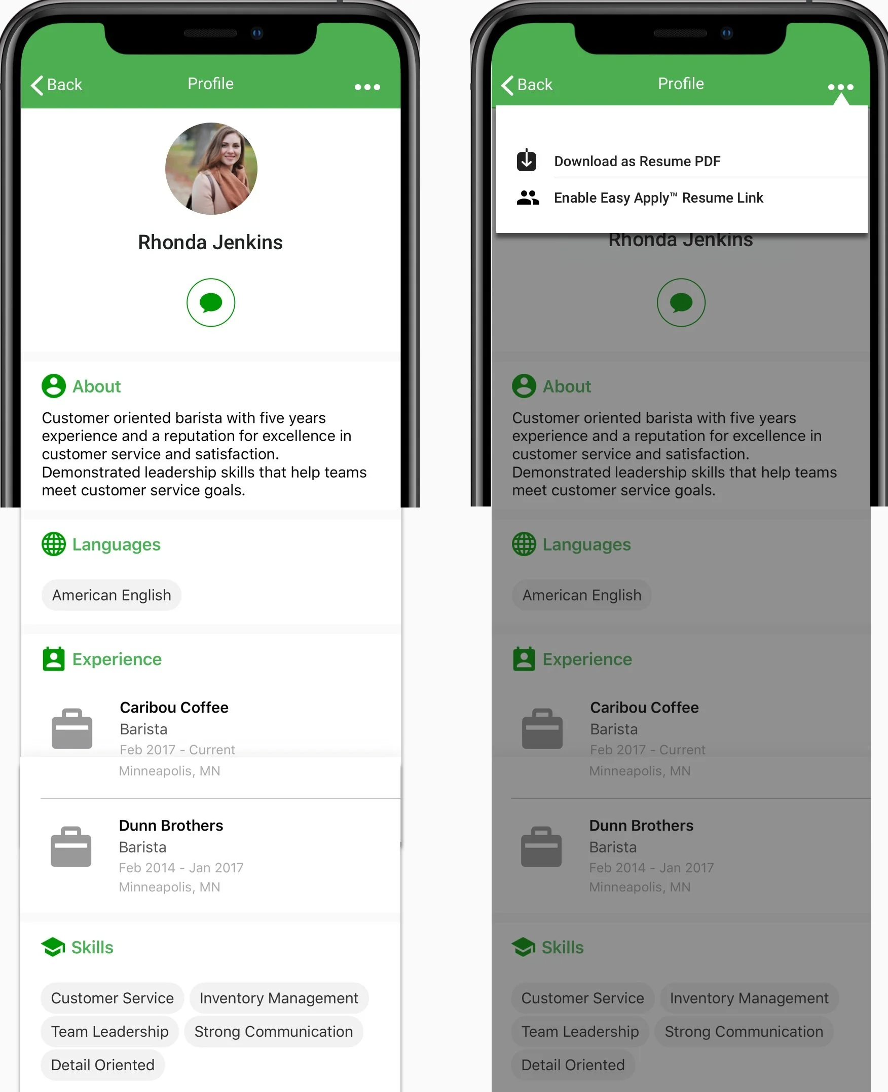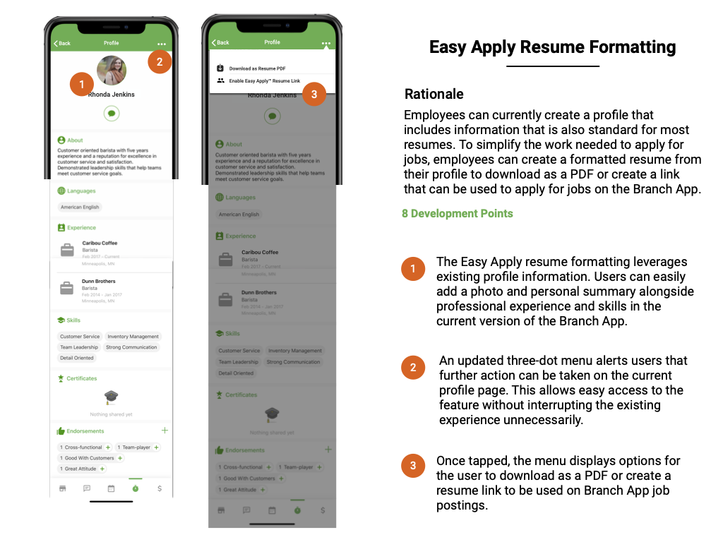 The Easy Apply resume formatting leverages existing profile information. Users can easily add a photo and personal summary alongside professional experience and skills in the current version of the Branch App. An updated three-dot menu alerts users that further action can be taken on the current profile page. This allows easy access to the feature without interrupting the existing experience unnecessarily. Once tapped, the menu displays options for the user to download as a PDF or create a resume link to be used on Branch App job postings.