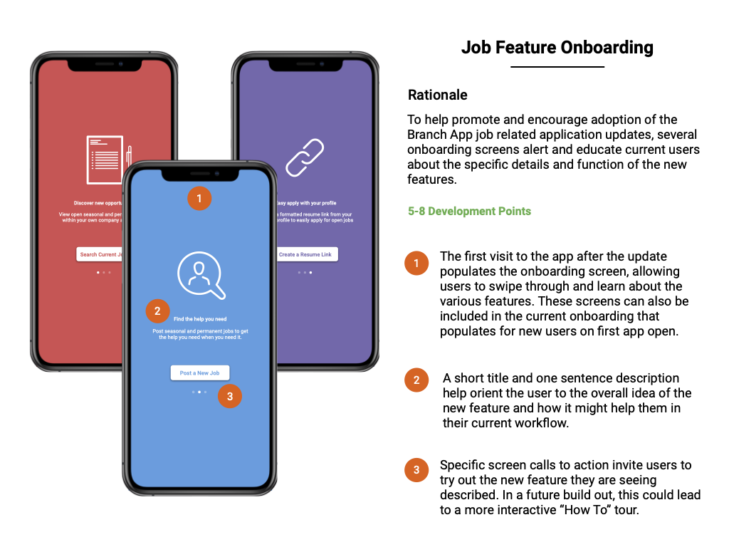 To help promote and encourage adoption of the Branch App job related application updates, several onboarding screens alert and educate current users about the specific details and function of the new features.