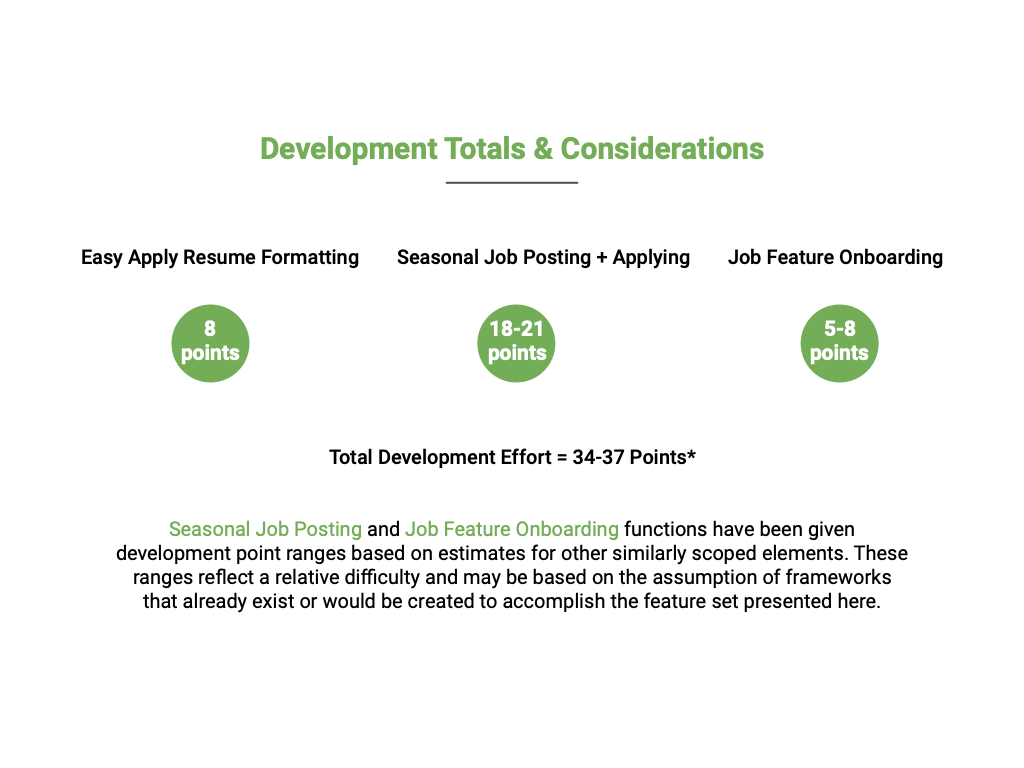 As part of our design evaluation and presentation to our Branch project sponsor and other leaders, it was important to us to provide a clear understanding of the potential investment that would need to be made to bring this potential new feature set to life. To do this, we held a brief consult with a development lead and another senior developer to estimate the size of effort for building each feature. The images below are from the document we presented to and shared with Branch leaders to summarize the potential features and the results of that effort consult. These were initial estimates* that were meant to provide a reasonable range of effort, not an exact commitment for development time required.