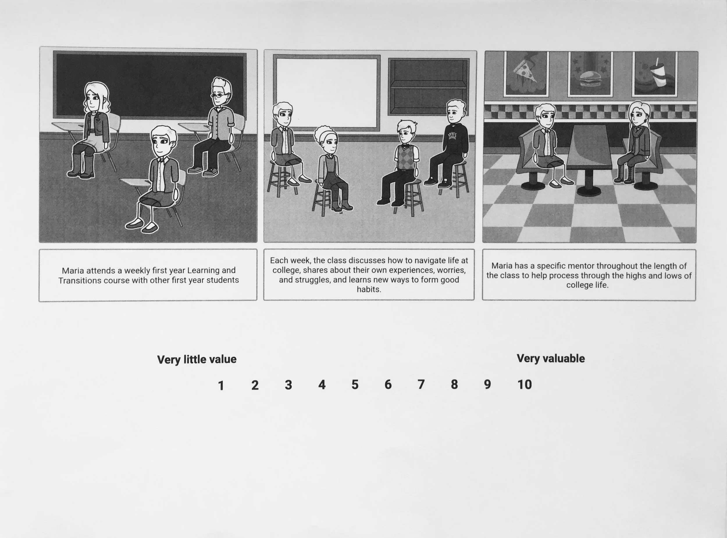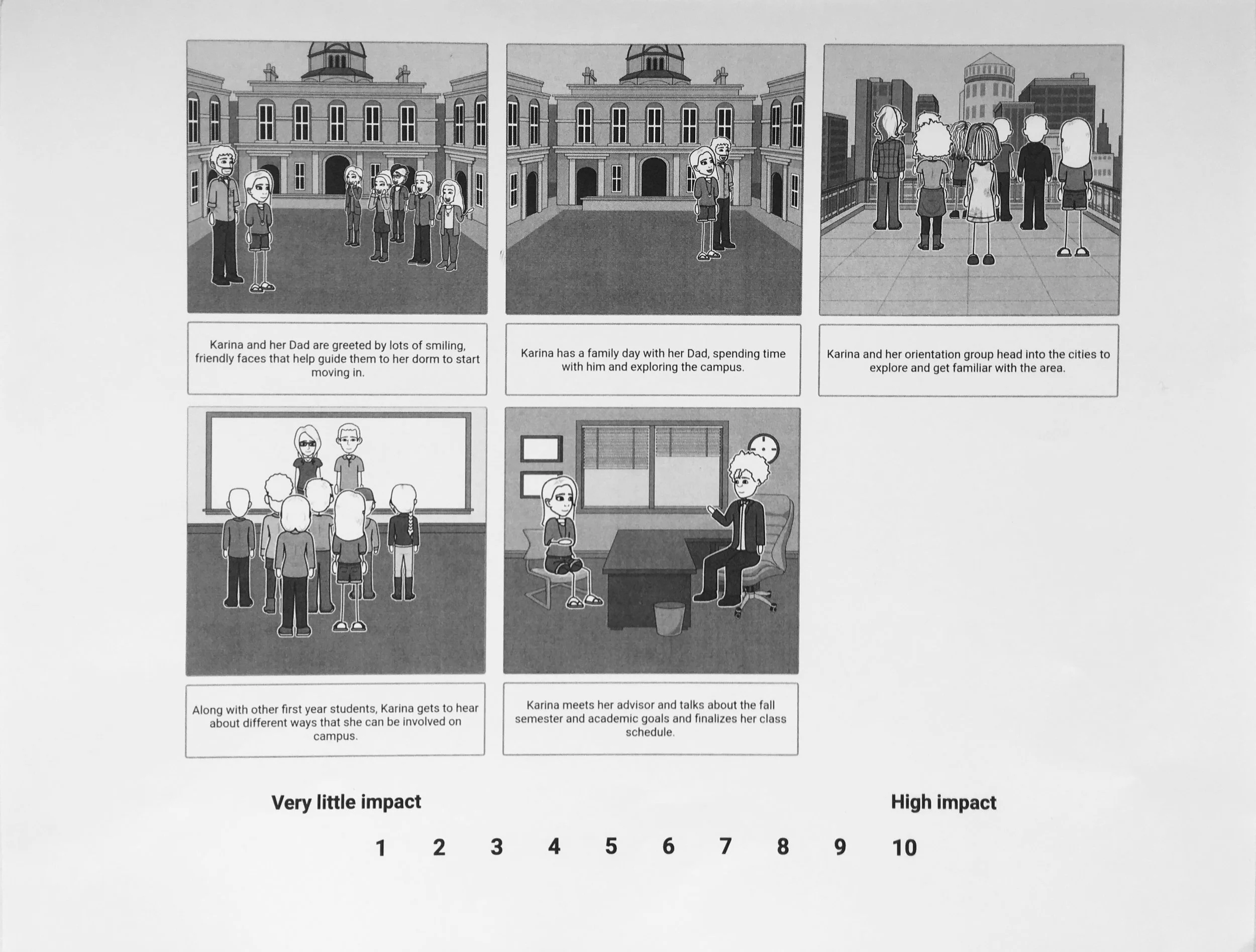During individual testing sessions, I showed storyboard scenarios of students interacting with the proposed touchpoints to gain feedback and insight. From the students, I was most interested to know if they could picture themselves in the scenario, how valuable the touchpoint would be to them, and how much it would have changed their current experience. From the staff, I wanted to learn how much impact the touchpoint would have on their day-to-day teams and work and what considerations would need to be made to put the touchpoint in place.