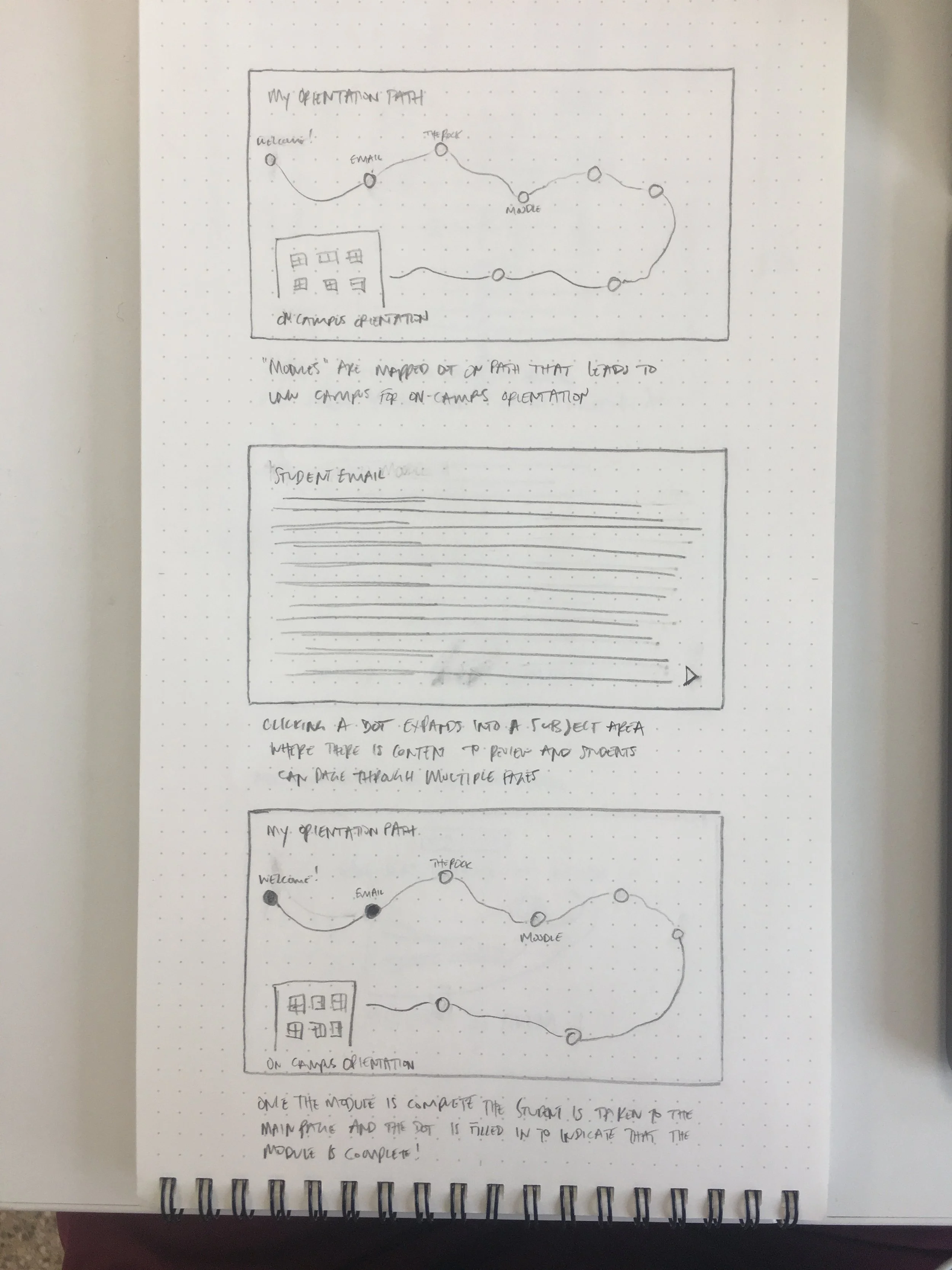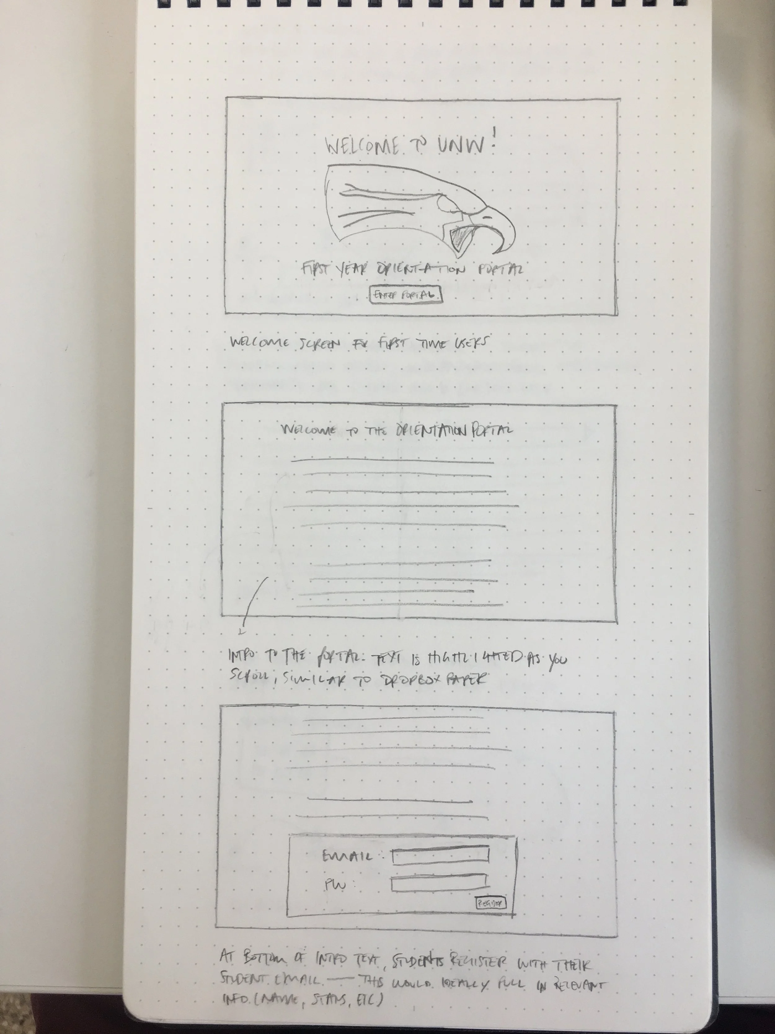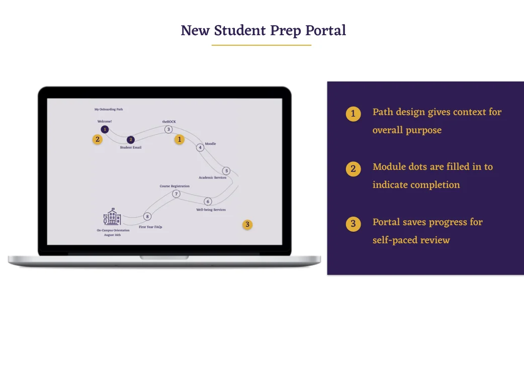 After some initial ideating and sketching, I created a mid-fidelity mockup of the new student prep portal, which would allow students to get familiar with the services and structures they’ll experience in their first year and beyond.
