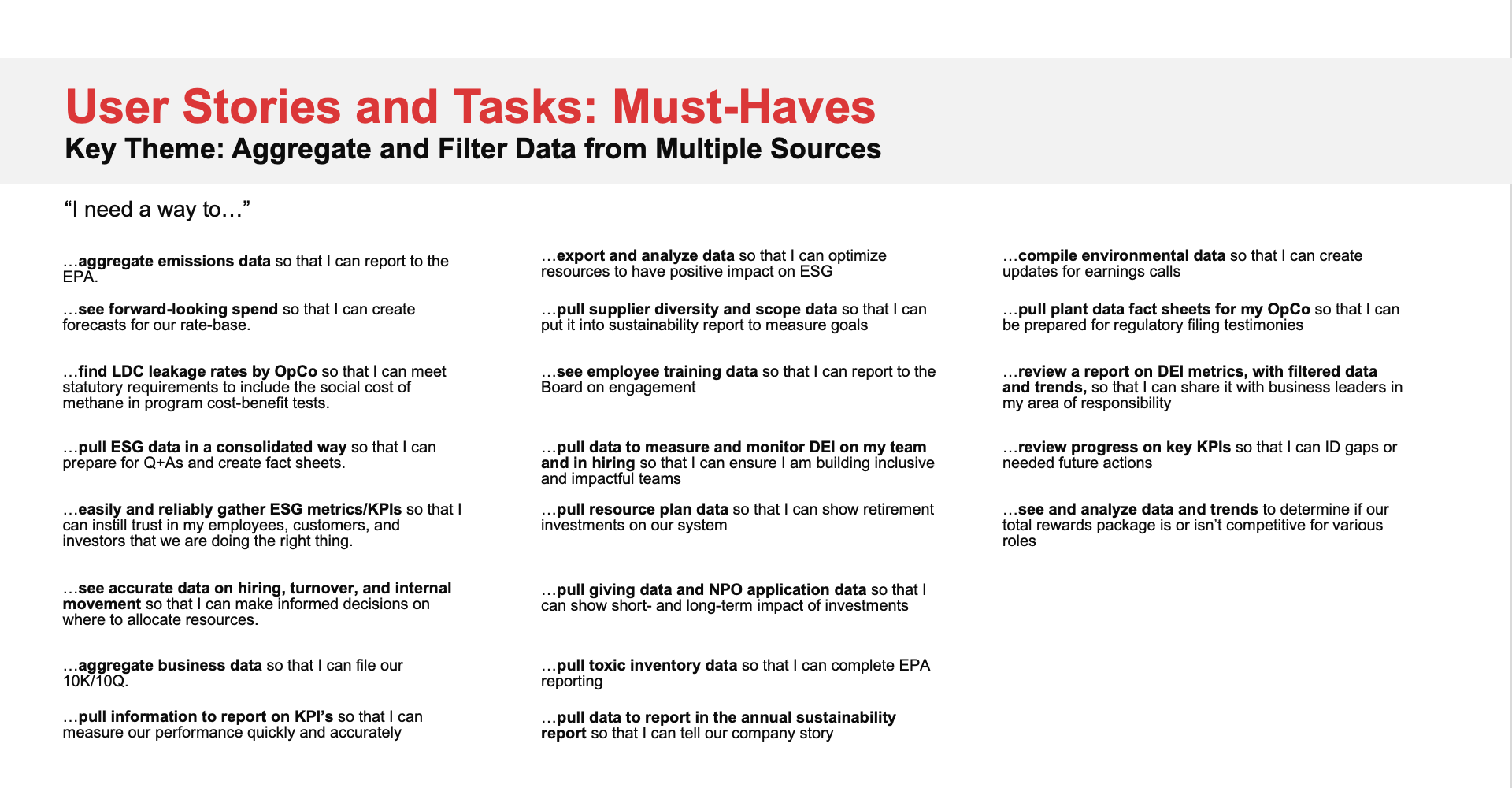 Our synthesis of requirements broke potential features of future sustainability data tracking platform into “must-haves”, “nice-to-haves”, and "next” categories, based on the time horizon we (and the client working group) believed best matched each feature.
